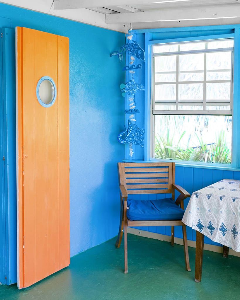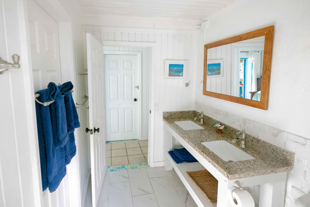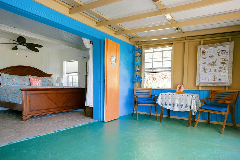 One king bed with Peacock Alley linens in the master bedroom and 2 twin beds in the second bedroom, en suite bathroom, AC and an adjoining room on the screened porch with a twin bed. Sleeps 4. This unit is next to the guest lounge and within the Beach House with kitchen and dining areas where guest meals are prepared and served. If you prefer more privacy, we recommend our Oceanfront 3BR Villa.